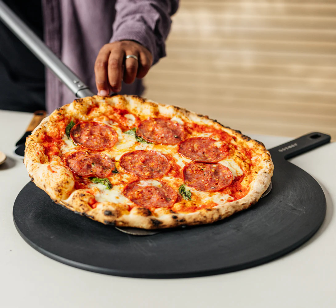 Die perfekte Pizza erfordert das perfekte Brett, Handarbeit, langlebig und strapazierfähig, das Gozney Pizzabrett ist nicht nur wunderschön, er ist auch leicht zu reinigen. 35 cm Pizza in Perfektion geschnitten und angerichtet.- Schwarze Faserplatte