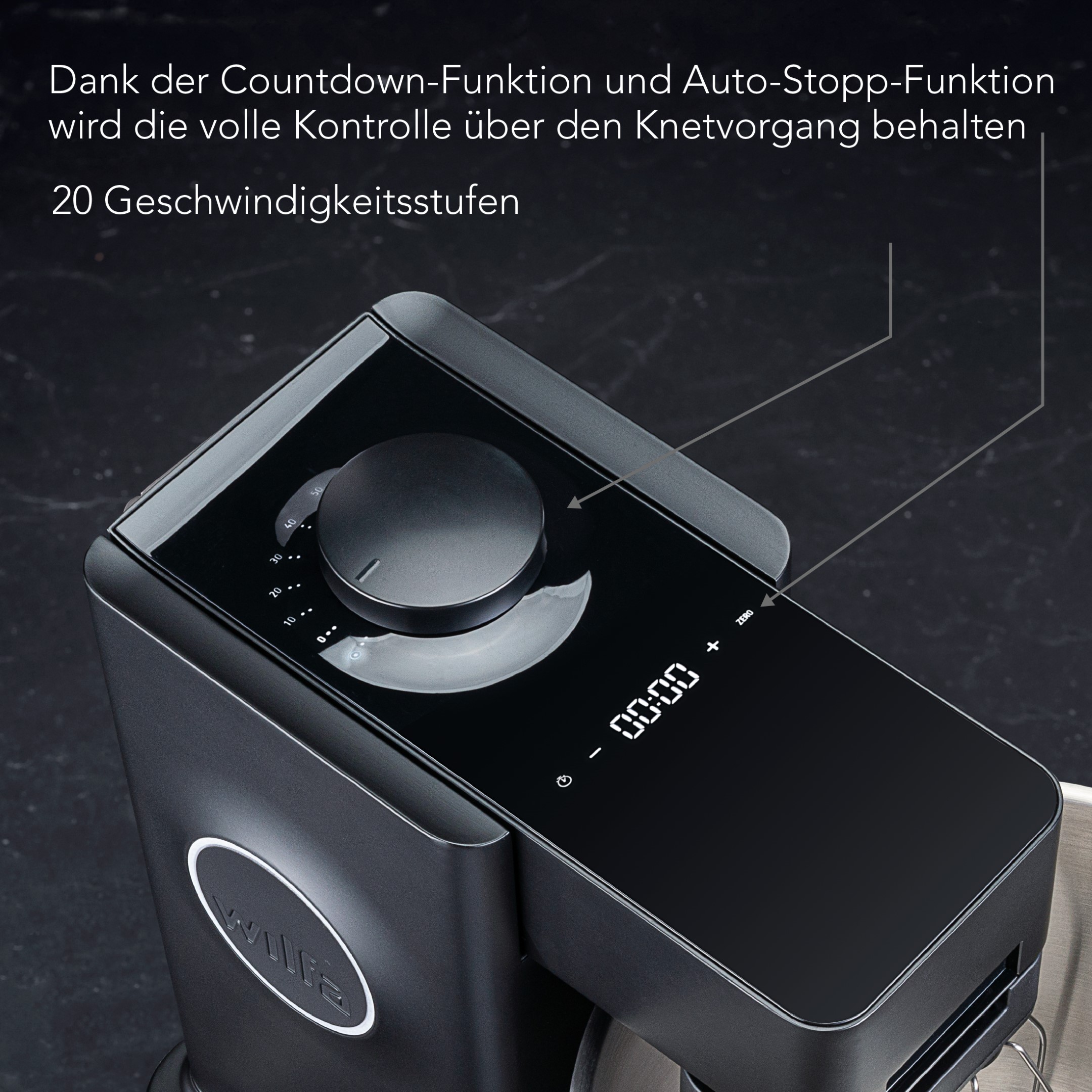 Die Wilfa Probaker-Timer KM2BS-T70 verfügt über eine stufenlose regulierbare Geschwindigkeitskontrolle mit Softstart-Funktion, welche die Maschine immer sanft anlaufen lässt und die Geschwindigkeit je nach Zubereitung exakt regulierbar ist. Dies verhindert Spritzer bei flüssigen Mischungen und sorgt für eine kontrollierte Verarbeitung der Zutaten, egal, ob langsames Kneten oder schnelles Schlagen gefragt ist.